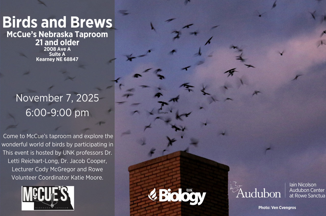 Come to McCue’s taproom and explore the wonderful world of birds, with UNK professors Dr. Letti Reichart-Long, Dr. Jacob Cooper, Lecturer Cody McGregor and meet Rowe Volunteer Coordinator Katie Moore. Learn more about Nebraska birds by participating in bird trivia! Learn what research is being done at UNK and how to volunteer out at Rowe.