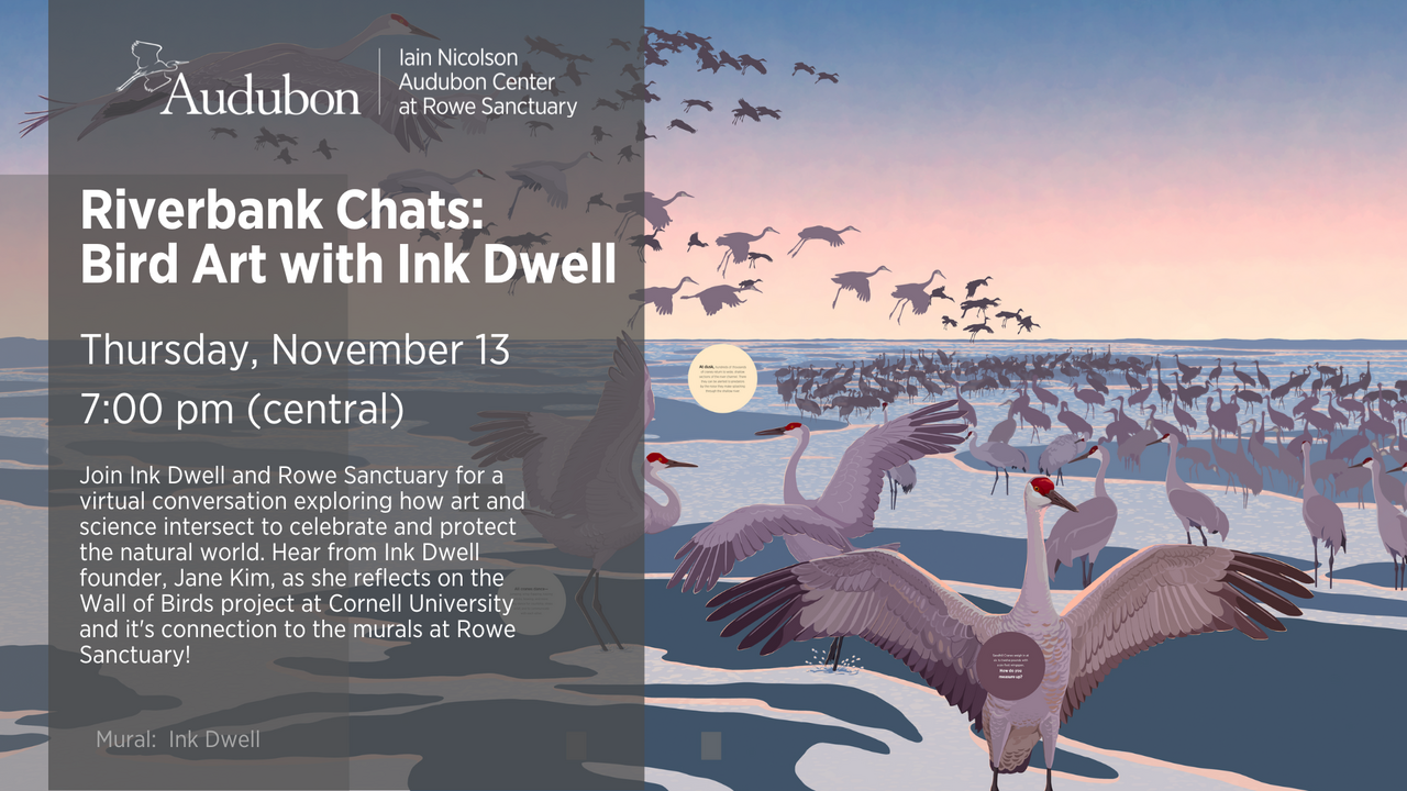 Join Ink Dwell and Rowe Sanctuary for a virtual conversation exploring how art and science intersect to celebrate and protect the natural world. Hear from Ink Dwell founder Jane Kim as she reflects on the Wall of Birds project at Cornell University (celebrating 10 years!) and it's connection to the murals at Rowe Sanctuary (celebrating 1 year!). Discover the stories, species, and inspirations behind these works and their connection to the Central Flyway. Learn how art can illuminate conservation challenges, inspire action, and deepen our connection to the Great Plains.
