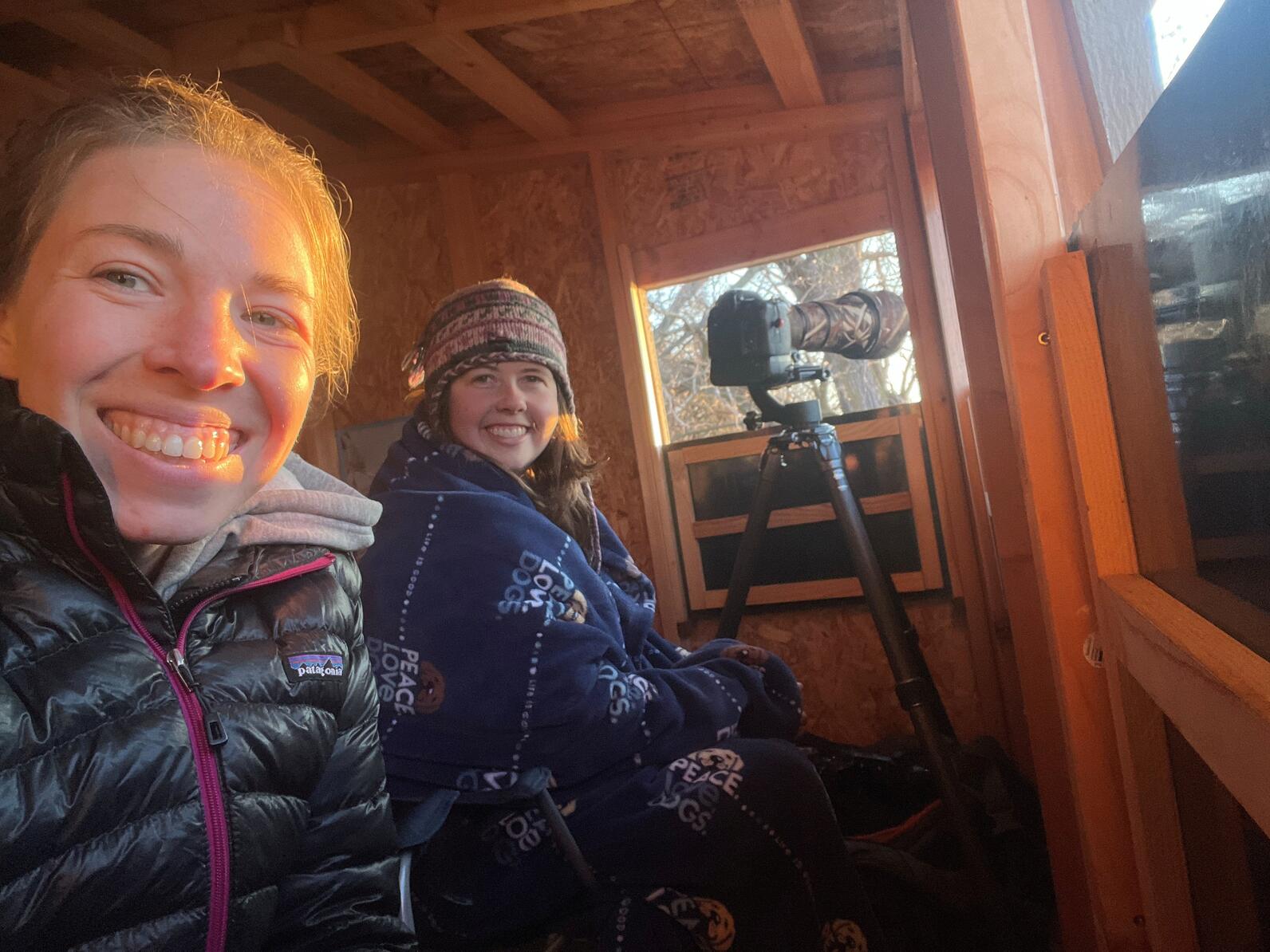 Q: The overnight blinds are 6 ft. H x 8 ft. W x 6 ft. D., with carpeted 4 windows designed for seated viewing. Is there enough space for two people plus gear? A: The blinds are a pretty cozy set up, with just enough room for 2 sleeping bags. There is enough room for photography equipment (i.e. 2 tripods) and 2 chairs if you wait to set up your sleeping bags until bedtime.