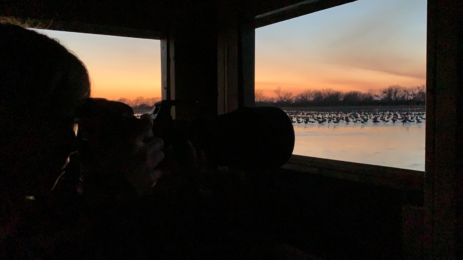 Q: What is the process of getting to and from the overnight blind like?  A:  When guests arrive, they should park in the back of the parking lot and check in at the front desk of our visitor's center. From there, a volunteer or staff member will coordinate the pick up of your gear from your car with a UTV, and you will get a ride out to the riverside overnight blinds. In the morning, a volunteer picks overnighters up after cranes have left the river (around 8:30-9:30 am).